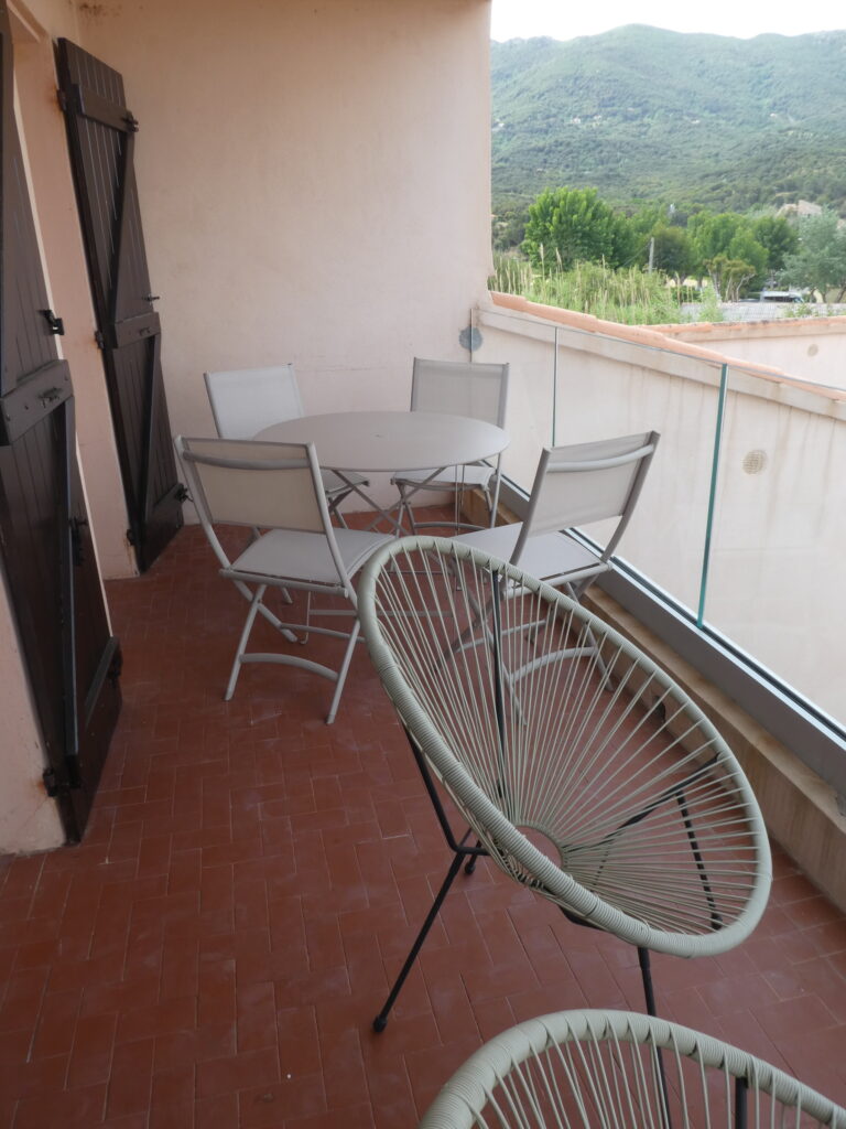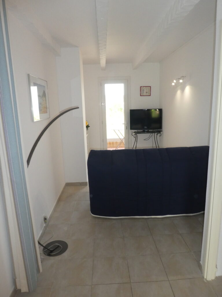 L’appartement de 40 m2 comporte : une entrée, une chambre, un petit coin salon, une salle de bain, un WC séparé, un balcon face à la mer et une terrasse donnant sur la Résidence et la montagne.