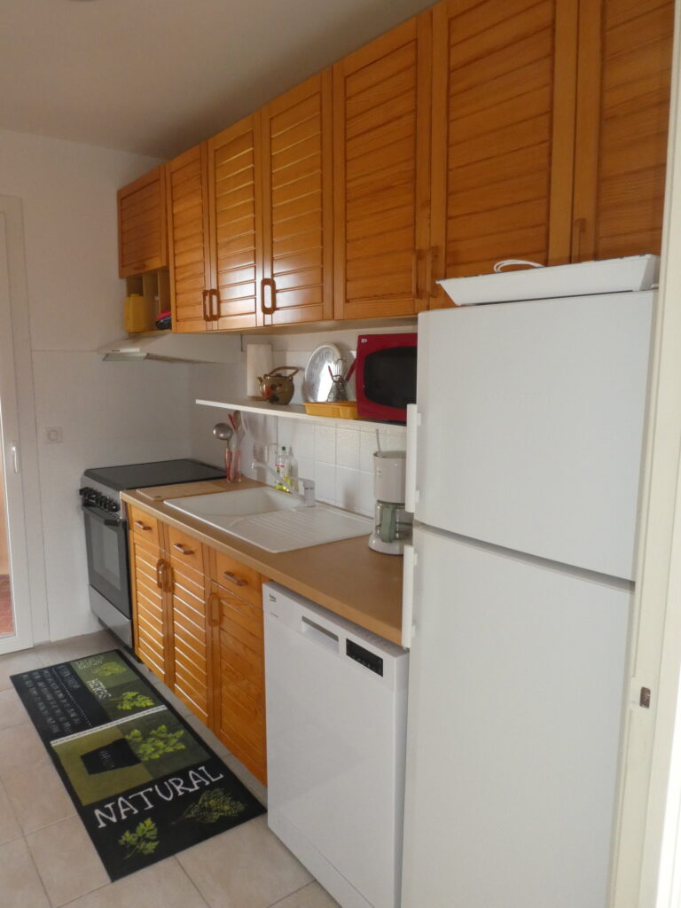 Elle comporte : cuisinière électrique, micro-onde, lave-vaisselle, réfrigérateur avec module congélateur